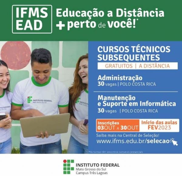 IFMS está com 60 vagas abertas para cursos técnicos a distância em Costa Rica